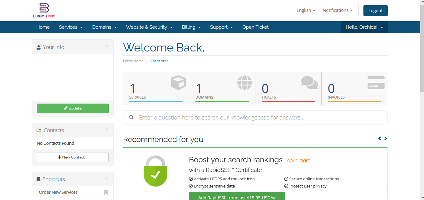 The ButumHost Client Portal is where you manage all of your web hosting services, email hosting sevices, domain name registrations, log support tickets, pay invoices, and more.